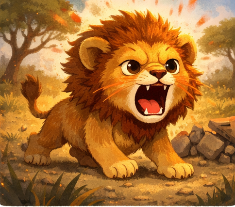 Leo war ein junger Löwe mit einer weichen, noch etwas struppigen Mähne. Er lebte mit seiner Familie in der warmen Savanne, wo die Sonne morgens golden über das Gras strich. Meistens war Leo fröhlich und verspielt. Er liebte es zu rennen, zu springen und mit den anderen Tierkindern Fang zu spielen.